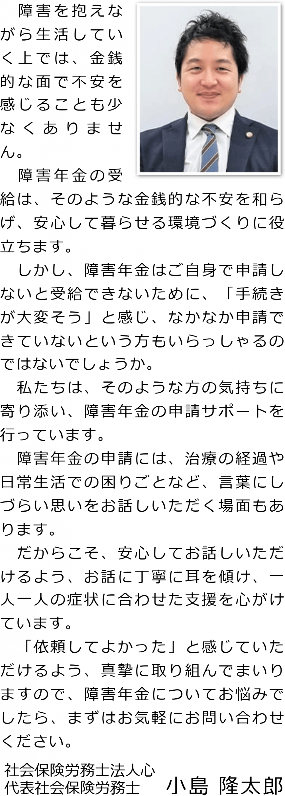 障害年金申請をされる方が、障害年金に関するご相談や申請についてのサポートを専門家に任せることで、適切な障害認定を受けるお手伝いをさせていただきます。